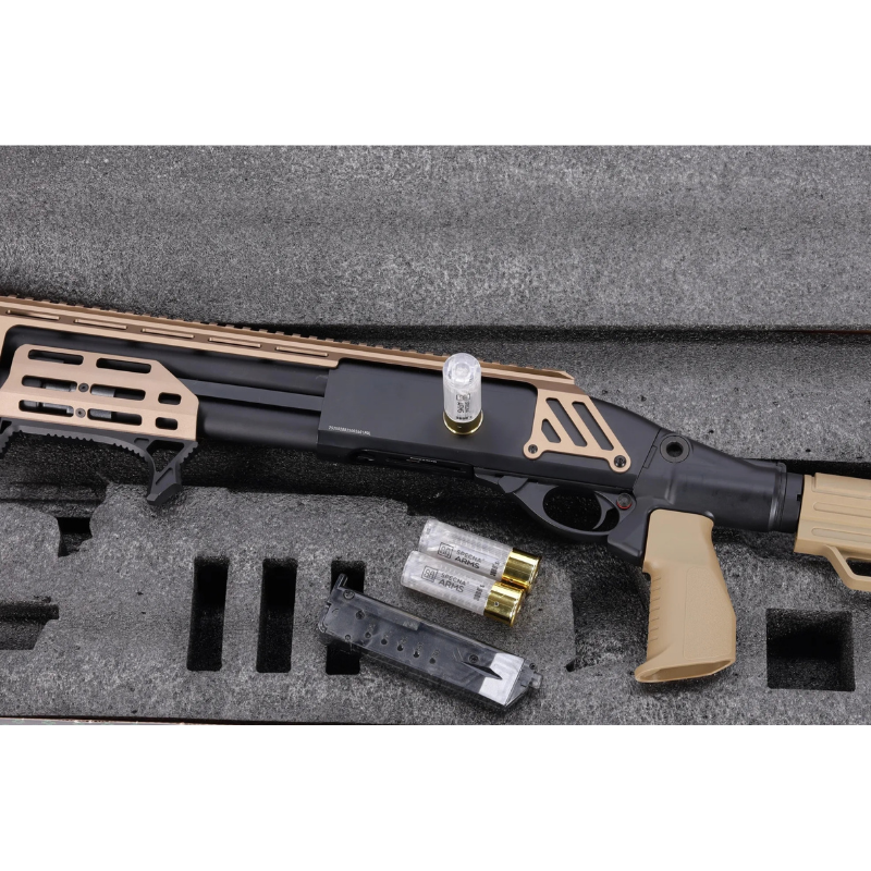 Kompakt, gasdrevet pump-shotgun til CQB-spil. SA-VGS1 kombinerer metal-byggelementer med holdbar polymer, har M-LOK håndguard, teleskopisk kolbe og Picatinny-rail for optik — designet til hurtig håndtering, realistisk følelse og god tilpasningsmulighed med greb, lygte eller sigte. Et robust våben til spillere der vil have funktionalitet og taktisk fleksibilitet i tætte baner.