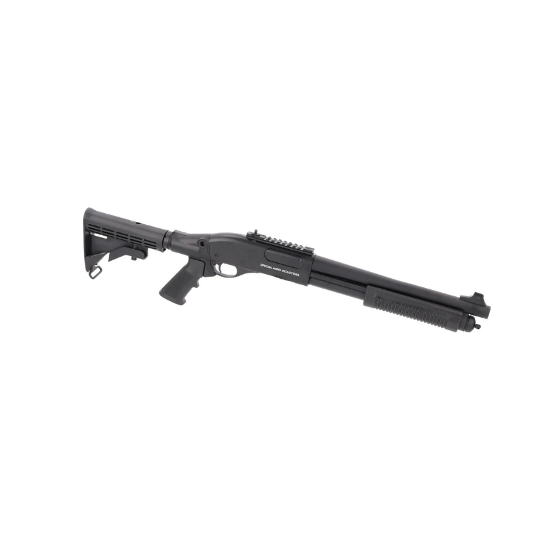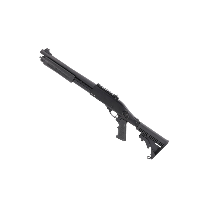 er en kompakt, let og taktisk pump-shotgun drevet af green gas — designet til hurtige, tætte runder hvor manøvredygtighed og pålidelighed tæller. Den kombinerer metal med holdbar polymer, integreret gasreservoir og en taktisk, justerbar kolbe, så du får stabil følelse af den og nem tilpasning i felten.