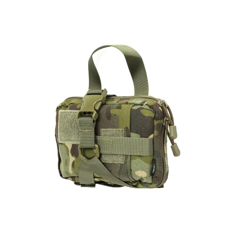 Kompakt, taktisk førstehjælpskit i Multicam Tropic — designet til hurtig adgang og nem montering på vest eller bælte under spil og træning.