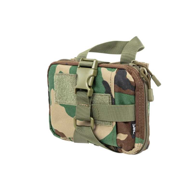 Kompakt, taktisk førstehjælpskit i Woodland — designet til hurtig adgang og nem montering på vest eller bælte under spil og træning.