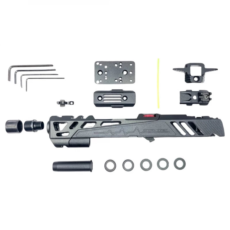 The slide is made from highly durable 6061 aluminum with precise CNC machining and features a split-slide design with a modification for a fixed outer barrel (non-recoil).