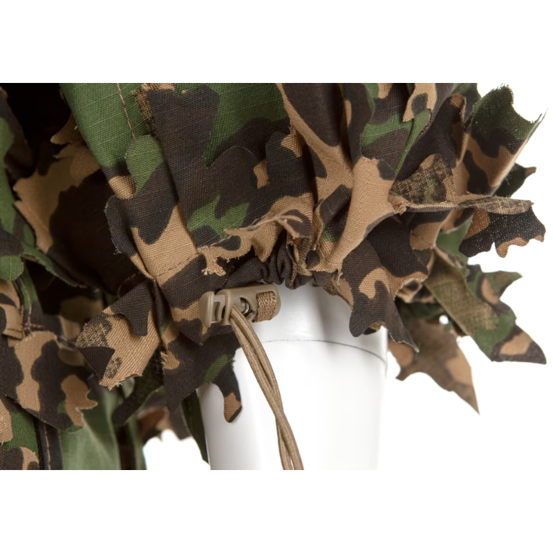 Dragten består af en bolero-type overdel kombineret med en kappe med påsyet camouflage-net og bladformede stofelementer, som bryder silhuetten effektivt. Den forlængede kappe giver ekstra dækning og gør det nemt at tilføje naturlig vegetation fra terrænet for endnu bedre camouflage.