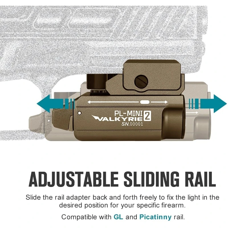 OLIGHT Valkyrie PL-Mini 2 er en kompakt og kraftfuld pistolmonteret lygte med en lysstyrke på op til 600 lumen. Den er designet til taktisk brug og passer perfekt til airsoft pistoler samt andre platforme med kompatibel rail.